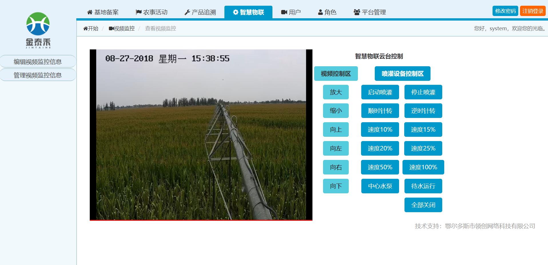 智慧农业,互联网+农业金泰禾智慧农业管理系统是金泰禾公司委托领创科技开发的一款互联网+农业管理平台,该系统主要功能包括:基地备案管理,农事活动记录,农产品种植信息追溯,种植产地视频监控,远程控制喷灌系统启停,以及种植数据统计...
